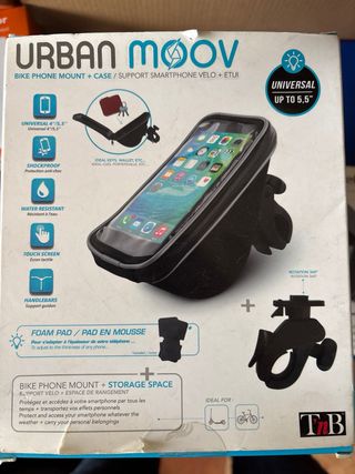 Soporte para smartphone impermeable de la marca URBAN moov, ideal para bicicletas y scooters. Permite el uso de la pantalla táctil. - Universal para pantallas de hasta 5.5 - Protección contra golpes y salpicaduras de agua - Soporte para manillar