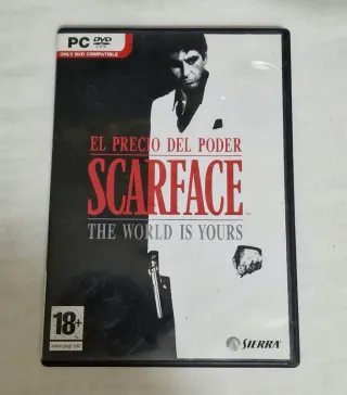 Videojuego Scarface World is yours para PC en formato DVD-ROM desarrollado por Sierra (Fear, Crash Bandicoot Twinsanity, Fuel, etc.). Juego de acción tipo GTA basado en la película del mismo nombre. Secuela alternativa de la película, donde Tony Montana sobrevive al tiroteo final. El objetivo principal es reconstruir el imperio criminal de Tony en Miami, recuperar territorios de bandas rivales y vengarse de Alejandro Sosa.
