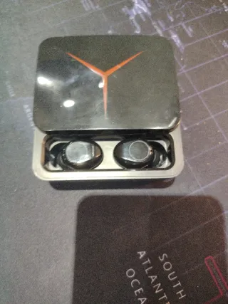 Auriculares bluetooth de color negro con carga de porcentaje en su caja.