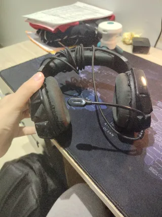 Auriculares con cable para gaming, diseñados para una experiencia de juego inmersiva. Cuentan con un micrófono integrado. - Diseño ergonómico. - Almohadillas cómodas. - Cable duradero.