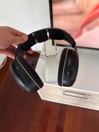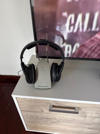 Auriculares inalámbricos Sennheiser en color negro y plateado. Ideales para disfrutar de audio sin cables. - Diseño ergonómico para mayor comodidad. - Base de carga incluida.