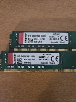 2 Módulos de memoria RAM DDR3 de 8GB de Kingston. - Modelo: KCP316ND8/8 - Voltaje: 1.5V