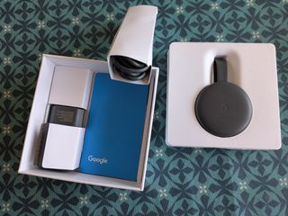 Pack de Google Chromecast de segunda generación y un Google Nest Mini. - Chromecast con diseño redondo y cable HDMI. - Nest Mini en color gris oscuro. Importante: el google Nest Mini no tiene cargador.