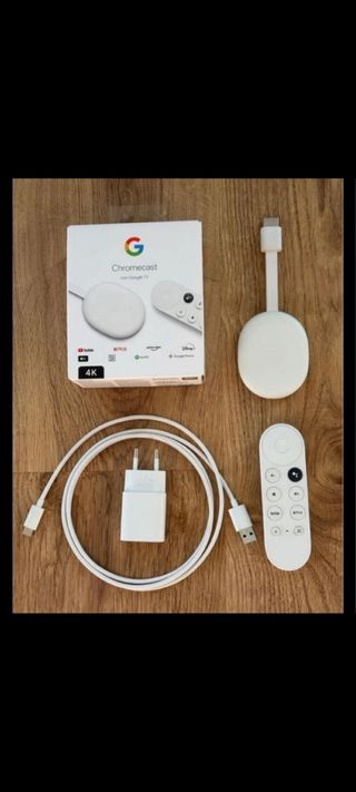 Dispositivo de streaming Chromecast con Google TV en color blanco NUEVO - Incluye mando a distancia. - Cable de alimentación USB-C. - Adaptador de corriente. Si quieres más fotos del producto mándame un mensaje :)