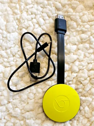 Dispositivo de streaming Google Chromecast de segunda generación. Permite enviar contenido desde tu teléfono o tablet a la televisión. Usado tres veces - Diseño redondo y compacto. - Conexión HDMI. - Compatible con aplicaciones como YouTube, Netflix, Spotify y más.