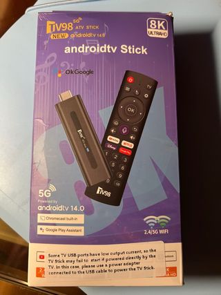 Disfruta de tus contenidos favoritos con este Android TV Stick. - Conectividad 5G WiFi. - Compatible con 8K UltraHD. - Incluye control remoto. - Funciona con Android TV 14.0. - Chromecast built-in. - Asistente de Google Play.