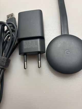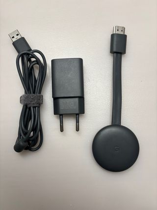 Dispositivo de streaming Google Chromecast en color gris oscuro. Incluye su cargador y cable de alimentación.