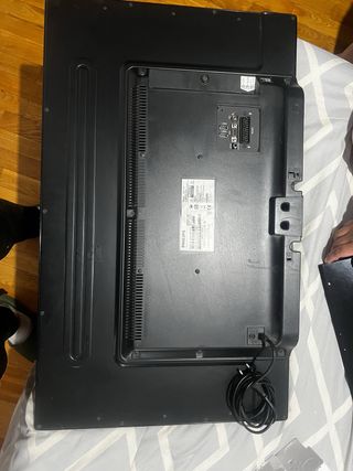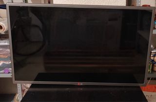 Televisor LG de 32 pulgadas. No es smart tv, aunque tiene puertos para poner chromecast o Amazon fire. No tiene base, tiene la estructura para colgar en la pared. Incluye mando universal y cable de corriente