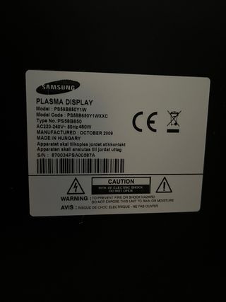 Televisor Samsung Plasma de 58 pulgadas en muy buen estado. - Modelo PS58B850. - Pantalla de plasma. - Diseño elegante. - Decodificador de regalo. - Excelente calidad de imagen. - Se puede usar con Chromecast/Fire TV/Android TV Box - Recogida en Pamplona/Iruña