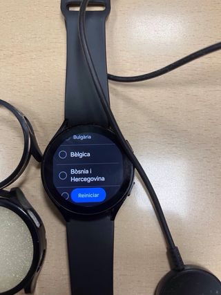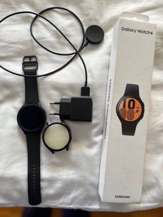 Reloj inteligente Samsung Galaxy Watch 4 en color negro. Incluye cargador y caja. - Reloj inteligente. - Cargador inalámbrico. - Adaptador de corriente. - Caja original.