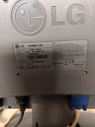 Monitor LG FLATRON L1715S en color plata. - Modelo: L1715SN-ANEUEP - Número de serie: 511WACM2U699 - Fabricado en noviembre de 2005 - Alimentación: AC100-240V 50/60Hz 1.0A - ID de FCC: BEJL17NP Se incluye teclado