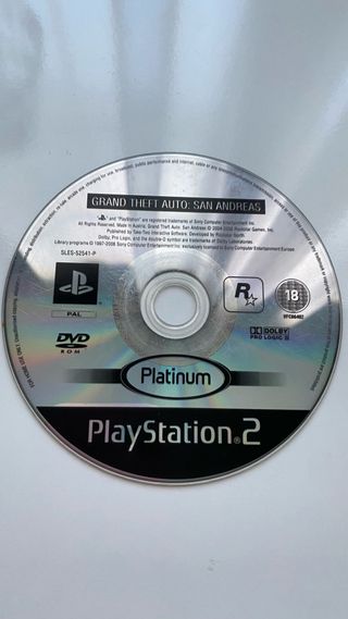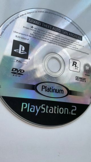 Disco de juego Grand Theft Auto: San Andreas para PlayStation 2. - Edición Platinum. - Incluye el juego en formato DVD ROM. - Clasificación por edad: 18. - Compatible con PAL.