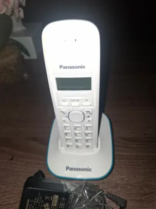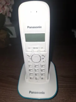 Teléfono inalámbrico Panasonic con base. - Diseño moderno en blanco y azul. - Teclado numérico completo. - Pantalla LCD.