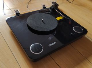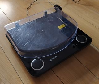 Tocadiscos ION Audio MAX en acabado negro brillante. Cuenta con una tapa protectora transparente y dos altavoces integrados. MUY POCO USO. - Diseño moderno y elegante. - Altavoces estéreo incorporados. - Tapa protectora abatible.