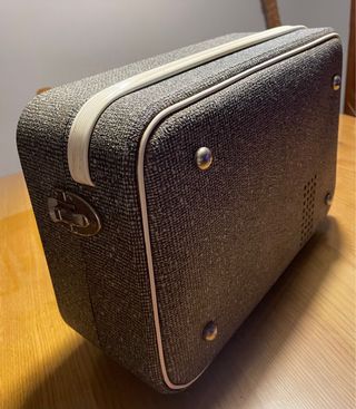Tocadiscos de estilo retro de los años 50. Un objeto con un diseño clásico y elegante. - Estructura con acabado texturizado. - Ribetes en contraste. - Asa de transporte. - Pies de apoyo metálicos. No funciona, pero se puede reparar Es de marca Claude pero la App no me deja ponerlo