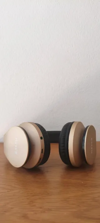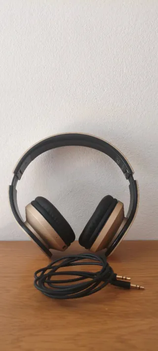 Auriculares con conexión Bluetooth y jack, listos para usar con tu dispositivo. - Cable jack incluido para conexión por cable. - Diseño elegante en tonos dorados y negros.