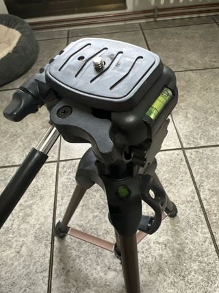 Trípode fotográfico con sistema de nivelación para asegurar tomas precisas. - Altura ajustable. - Plato de liberación rápida. - Burbujas de nivel integradas.
