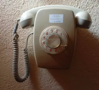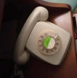 Teléfono fijo de estilo antiguo, con un diseño clásico que evoca épocas pasadas. Su acabado en tonos beige y gris le da un toque retro. - Marcación giratoria. - Cable en espiral. - Etiqueta de identificación visible.