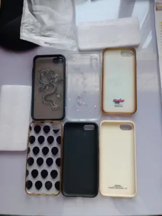 Lote de fundas para móvil con diversos diseños. - Funda con diseño de dragón. - Funda transparente con flores y estrellas. - Funda con personajes de Las Supernenas. - Funda con estampado de aliens. - Funda negra con dibujo de dinosaurio. - Funda con ilustración de estilo anime. 2,50€ cada una. 10€ el lote entero de 6.