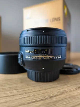 Objetivo Nikon AF-S Nikkor 50mm f/1.4 G. Los cristales y el funcionamiento son perfectos, sin ningún rastro de polvo,hongos o cualquier tipo de roce en el cristal. La única pega es que el parasol cuesta un poco quitarlo, siempre lo llevo puesto. - Montura F. - Apertura máxima f/1.4. - Distancia focal de 50mm.