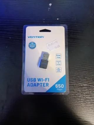 Adaptador USB Wi-Fi de Vention, compacto y portátil. - Velocidad de 650 Mbps. - Driver-Free. - Compatible con 2.4GHz. - Diseño compacto y portátil. Está completamente nuevo. Usado unos pocos días para ir instalando cosas en mi nuevo ordenador hasta comprarme otro