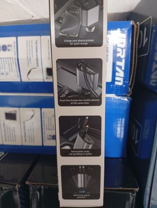 Cargador de coche con pantalla digital y dos puertos USB. - Carga rápida para tu teléfono. - Permite cargar dos móviles a la vez. - Cables retráctiles para evitar enredos. - Ajuste de dirección de 180°.