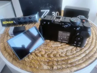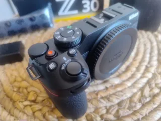 Cámara digital Nikon Z30 en color negro. Diseño compacto y ligero. - Cuerpo de cámara. - Tapa de objetivo. - Correa de mano.