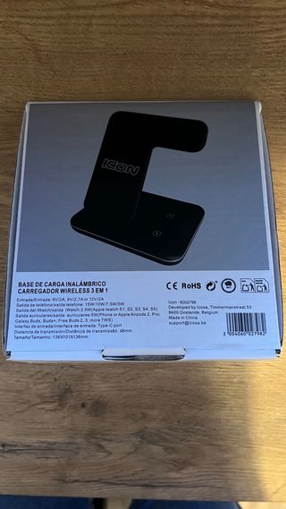Cargador inalámbrico 3 en 1 de la marca ICON. - Carga rápida de 15W. - Compatible con móviles Qi. - Compatible con iWatch S1-S5. - Compatible con estuches inalámbricos de auriculares.