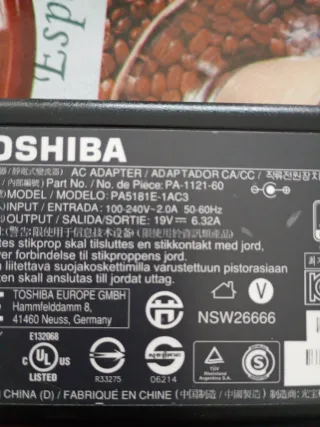 Adaptador de corriente Toshiba para equipos portátiles. - Modelo: PA5181E-1AC3 - Entrada: 100-240V~2.0A 50-60Hz - Salida: 19V 6.32 A