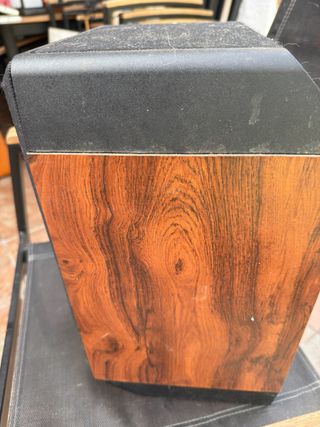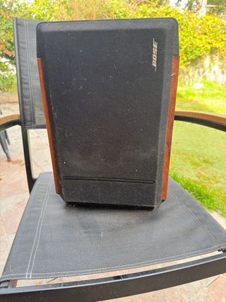 Altavoces Bose (301 serie IV) con un diseño elegante que combina madera y negro. - Acabado en madera con vetas oscuras. - Parte superior en color negro.