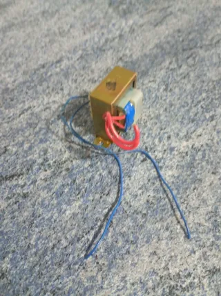 Transformador de potencia con carcasa metálica dorada y bobinado visible. - Cables de conexión rojos y azules. - Base metálica para montaje.