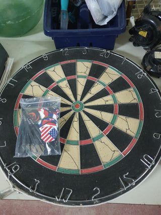 Diana de dardos profesional con un juego de dardos. - Diana de doble cara. - Incluye 3 dardos con plumas de bandera americana.