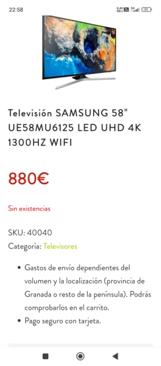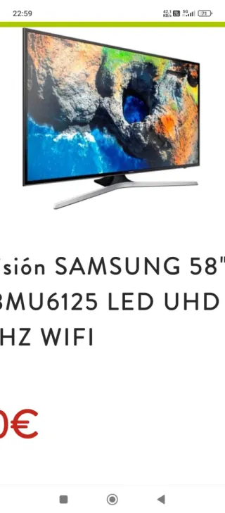 Televisor Samsung de 58 pulgadas con tecnología LED UHD. - Modelo MU6125. - Resolución 4K. - Conectividad WiFi. LO VENDO EN 350 EUROS FUNCIONA PERFECTAMENTE ESTÁ IMPECABLE, LO VENDO POR TENER VARIOS TELEVISORES.ABSTENERSE OFERTAS ABSURDAS PORQUE NO VOY A CONTESTAR, POR FAVOR LEAN BIEN ESCRIBAN SOLAMENTE PERSONAS INTERESADAS SI NO ESTÁ REALMENTE INTERESADO LE PIDO POR FAVOR QUE NO ESCRIBA EL COMPRADOR ANTES DE LLEVÁRSELO LO PROBARÁ GRACIAS