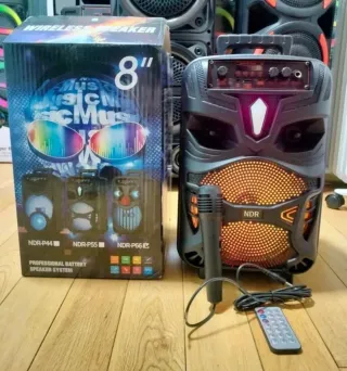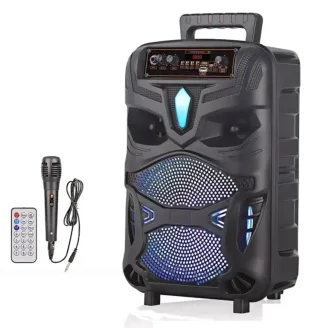 Altavoz portátil con luces LED y micrófono incluido. Nuevo, a estrenar. - Conectividad Bluetooth. - Incluye control remoto, mando a distancia y micrófono con cable. - Diseño moderno y compacto. - Batería recargable. - Bluetooth, USB, radio FM. - Suena alto y claro. Ideal para escuchar tu música favorita y amenizar tus fiestas y celebraciones.