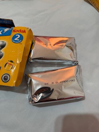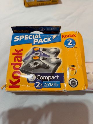 Pack de dos cámaras Kodak Compacto, ideal para capturar tus momentos. Incluye película para un total de 39 fotos. De un sólo uso. Vienen dos en cada paquete. Tengo 3 paquetes. - Cámaras Kodak Compacto. - Incluye 2x 27 + 12 fotos (39 fotos en total). - Flash integrado con alcance de 0.8m-5m.