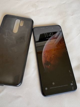 Teléfono móvil Xiaomi RedMi 9 en color negro. - Pantalla con fondo de pantalla de Marte. - Iconos de aplicaciones como Ajustes, Mi Video, Tiempo, Herramientas, Notas, Asistente, Navegador Mi, Más aplicaciones, Mi Pick, Instagram, Lens. - Botones de navegación inferiores: Llamar, Mensajes, Chrome, Cámara.