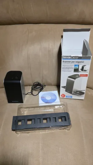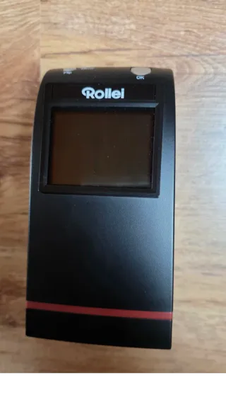 Escáner de negativos y diapositivas de la marca Rollei. Ideal para digitalizar tus recuerdos. - Diseño compacto y moderno. - Pantalla para previsualización. - Botones de control en la parte superior.