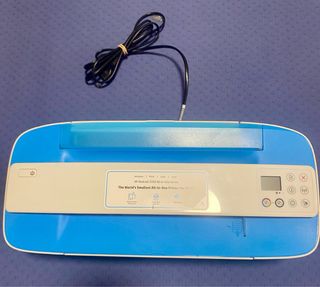 Impresora HP multifunción en color azul y blanco. Es compacta y versátil. - Funciones: Wireless, Print, Scan, Copy. - Modelo: HP DeskJet 3700 All-in-One Series. - Diseño compacto, ideal para espacios reducidos.