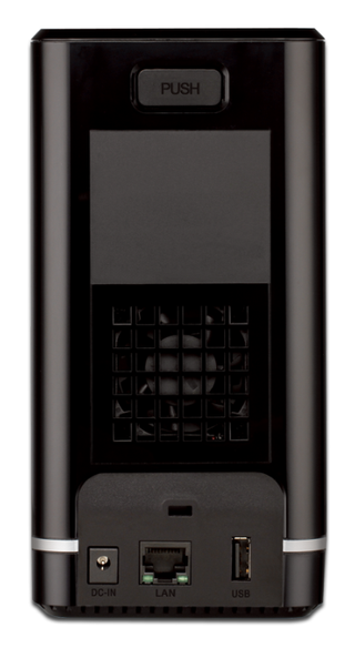 Dispositivo NAS D-Link ShareCenter con dos bahías para discos duros. - Diseño compacto y elegante en color negro. - Indicadores LED en la parte frontal.