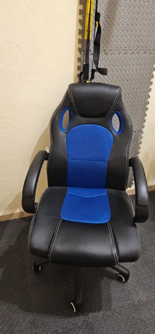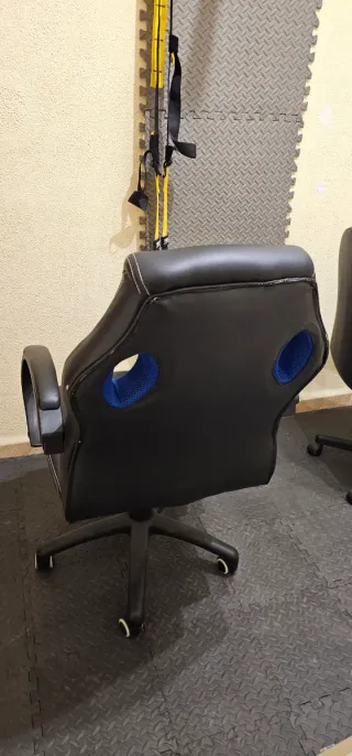 Silla de estilo gaming con un diseño moderno en color negro y detalles en azul. - Tapicería en polipiel. - Asiento y respaldo con inserciones de malla. - Costuras blancas decorativas. - Brazos acolchados.