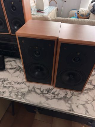 Sistema de cine en casa kef cresta . - Receptor AV - Altavoces traseros de madera. - Altavoz frontal de madera. - Altavoces superiores de madera. -sub JBC