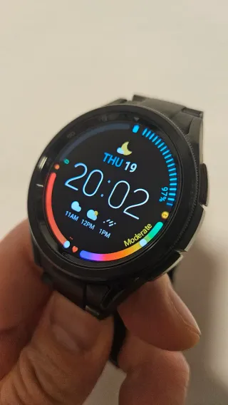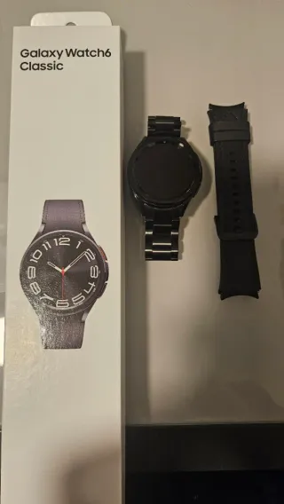 Reloj inteligente Samsung Galaxy Watch 6 Classic en color negro. Incluye caja y correa adicional. - Diseño elegante y moderno. - Correa de metal y correa de cuero incluidas.