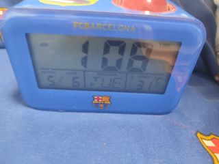 Reloj despertador del FC Barcelona, en color azul. Está en buen estado. - Es digital y muestra la hora, fecha y temperatura. - Incluye un diseño con el escudo del club.