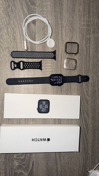 Reloj inteligente Apple Watch SE en color negro y plateado. Incluye cargador y correas adicionales. Es original e incluye las cajas originales. Sin mentir lo he usado 2 veces ( 1 cuando lo abrí y la segunda para hacer la foto para venderlo ) - Correa deportiva negra con detalles grises. - Correa deportiva negra. - Funda protectora plateada. - Cargador magnético.