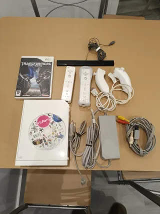 Consola Nintendo Wii en color blanco, lista para horas de diversión. - Incluye consola Wii. - Un juego Wii Party. - Un juego Transformers: The Game. - dos mandos - dos Nunchuk. - Cables de conexión y adaptador de corriente.