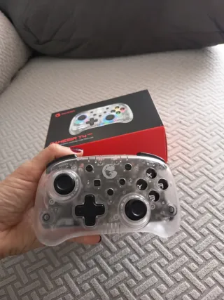 Mando de juegos transparente de la marca Gamesir, modelo T4 Mini. Ideal para múltiples plataformas. - Diseño transparente con iluminación LED. - Incluye cable de conexión.