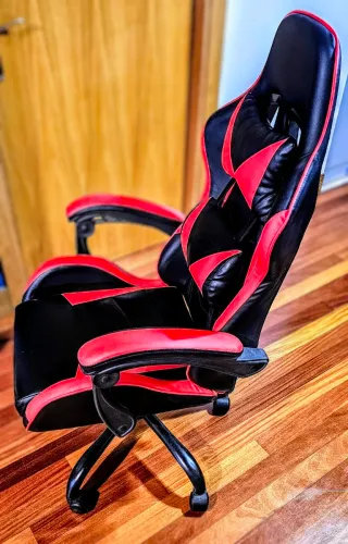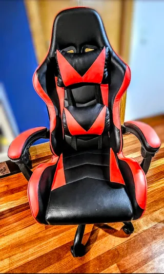 Silla gamer de diseño deportivo en color negro y rojo. - Ideal para cualquier tipo de entorno, ya sea para el trabajo, el estudio o para su ocio. - Estructura de metal negro. - Base de 5 ruedas giratórias a 360°. - Respaldo ergonómico. - Ajuste de altura, asiento y / o respaldo. - Medidas: - Altura mínima: 120 cm y máxima: 130. - Asiento: 39 cm Anchura. - Respaldo 82 cm. Excelente estado y listo para usar. ¡Acepto ofertas!