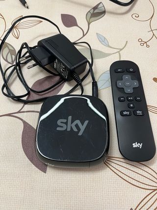 Decodificador Sky Roku TV Box en color negro. Incluye el mando a distancia y el adaptador de corriente. - Diseño compacto y moderno. - Fácil de conectar y usar.