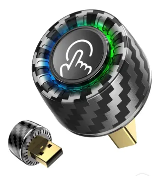 Adaptador USB con un diseño moderno y llamativo. Incluye un detalle de fibra de carbono y un anillo LED que cambia de color. - Diseño con acabado imitación carbono. - Anillo LED con iluminación gradual azul a verde. - Conector USB chapado en oro.