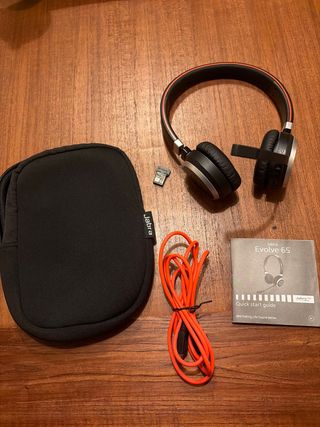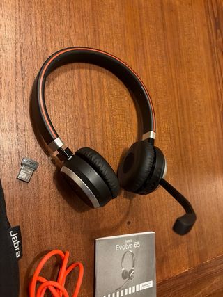 Cascos Bluetooth Jabra Evolve 65 para ordenador. - Incluye funda de transporte. - Incluye cable de carga. - Incluye dongle USB. - Incluye guía de inicio rápido.